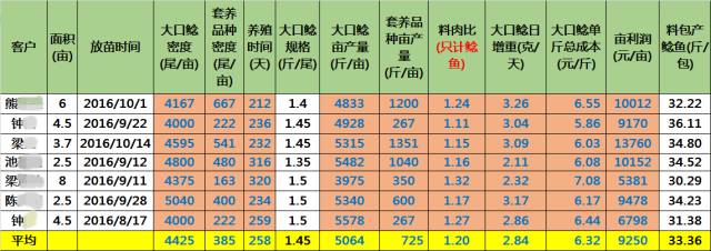 (备注:①、以上表格主要为玉林地区养户数据;②、此料肉比、包产量和单斤成本只计大口鲶的鱼重,其他吃料鱼如罗非和草鱼的鱼重没算在内;③、因养鱼普遍是分批卖的,以上的出售时间都是客户最后一批鱼的时间,可能有少量塘底鱼没算或数据根据客户估计的;④、亩产利润是包括所有鱼的收入减去总成本的单亩利润。)