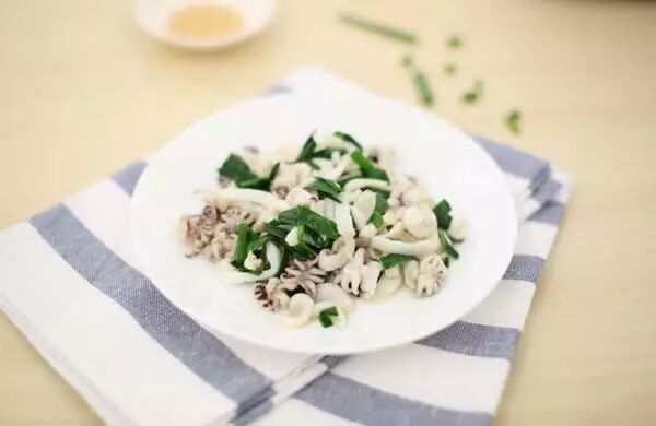 4. 炒锅预热后放一勺油,放入生姜爆香;加入墨鱼仔翻炒片刻后,下入韭菜快速翻炒均匀,加入盐调味即可。