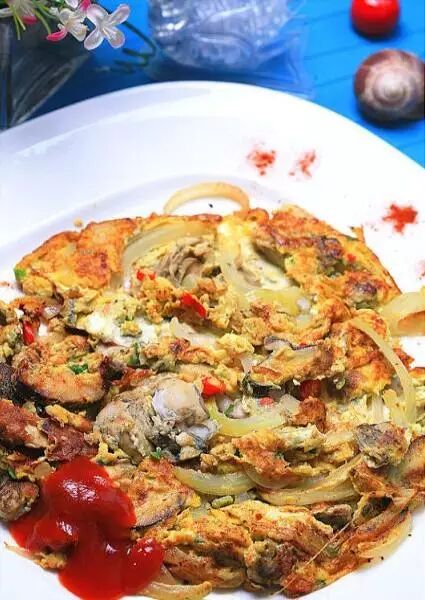 原料:牡蛎300克、鸡蛋150克、香菇50克、洋葱40克、小米椒15克、番茄沙司20克