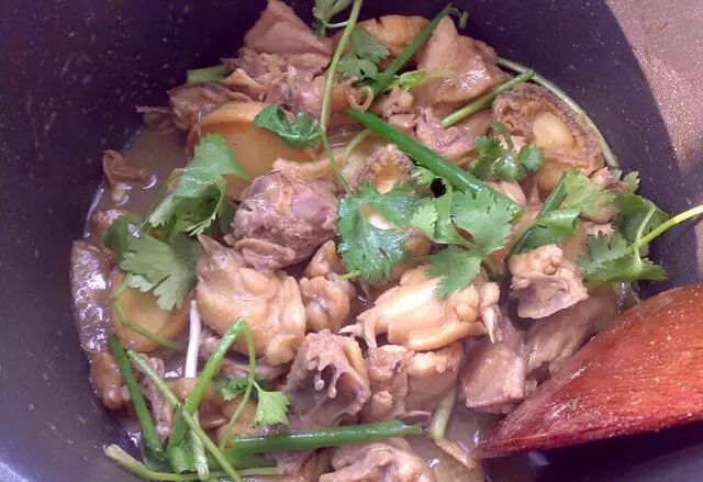 材料:鲜鲍、鸡肉、姜片、葱、香菜、花生油