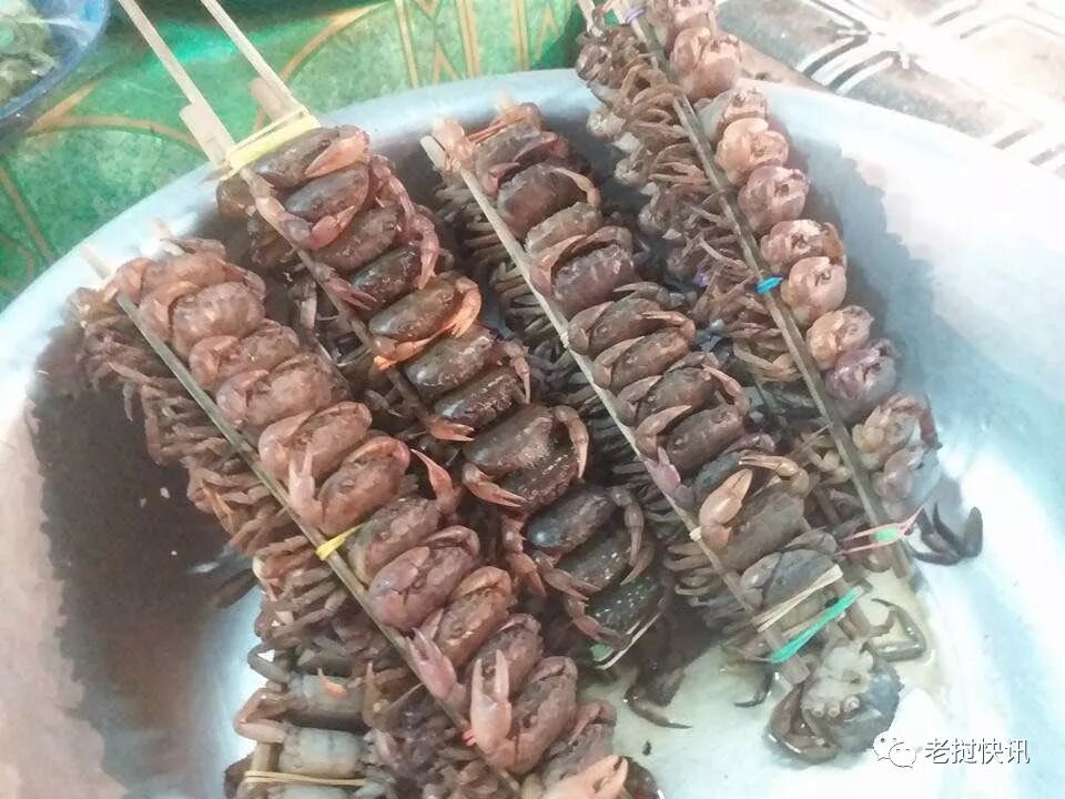 捉回来的田蟹,清水冲洗,有的直接穿成串用火烤,有的放入锅里煮熟,剥壳即可食用。煮熟了的田蟹肉肥脆,膏黄黄的,味道鲜美,可算上一道清淡自然的农家风味。当然,更少不了老挝人最喜欢的舂捣式的吃法,将田蟹放入臼里加进适中的盐、配上香茅草、辣椒等作料将其搅拌腌制,其味更是鲜美无比。