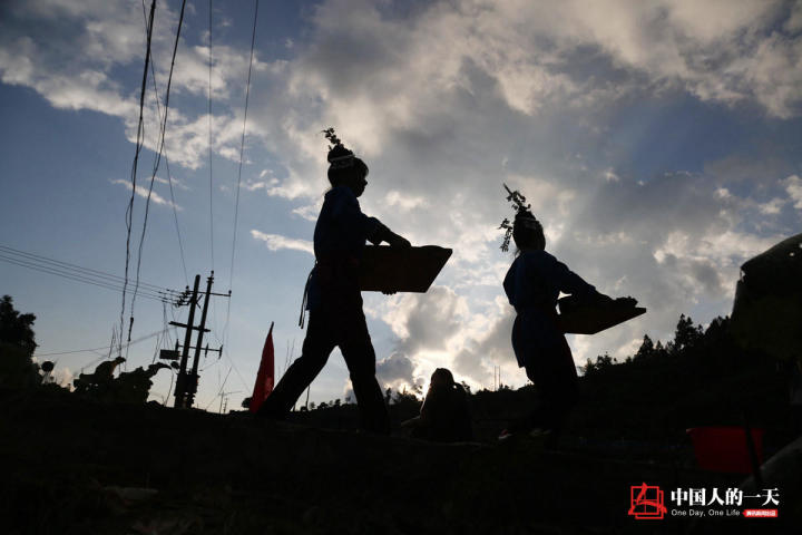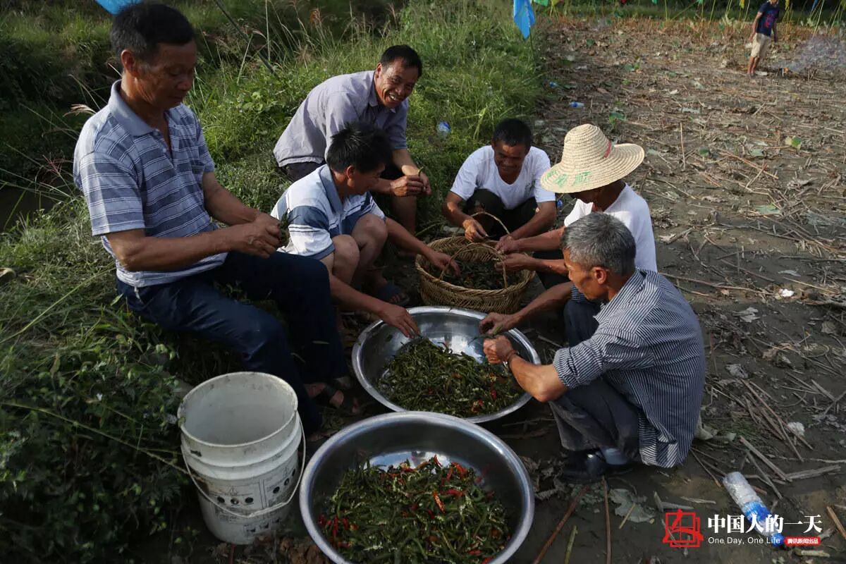 侗家人分工明确,一些人烧鱼,另一些人将烧制好的青椒撕碎以配烧鱼。