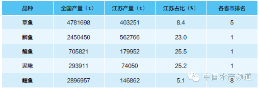 中国水产频道独家报道,江苏自古便是“鱼米之乡”,水产养殖业规模庞大,据中国渔业统计年鉴数据:2012年全国淡水池塘养殖面积为256.7万公顷,其中江苏省为37.1万公顷,居全国首位;2012年全国淡水鱼养殖总产量为2334万吨,其中江苏为234万吨,占据全国1/10;除去鲢鳙鱼,江苏主要淡水鱼养殖品种为鲫鱼、草鱼、鳊鱼、泥鳅、鲤鱼,这5个品种产量占据全省淡水鱼养殖总产量的近60%,具体情况见表1。