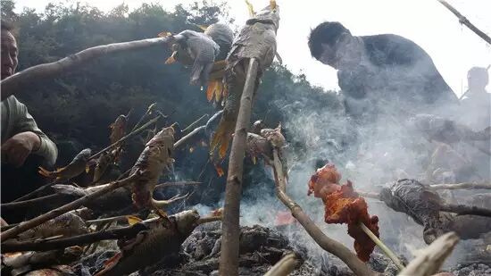 烧烤的方法有四种:一是串烧,将一跟削尖的竹子将鱼串好进行烧烤,此法多用于人多不便用之,既简便又快捷。二是用温火烘烤,以烤透内脏,把鱼烤至黄而不焦为佳。三是折来树枝条,将一头枝条削尖,用枝尖头将鱼单个从鱼嘴直插如至尾部,慢慢旋转烘烤,这种烤法,使鱼黄而不焦,其味特别芳香、鲜嫩、可口。四是将鲜鱼剖开,取出内脏,塞入生姜、葱、蒜、辣椒、花椒、盐等佐料,外扎一层厚厚的香茅草,用温火焙烤而成。焙烤时,香茅草沁出芳香油渗进鱼肉内,达到皮黄骨稣,肉嫩味鲜,特别可口。