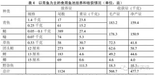 4、以青鱼为主的混养模式 以青鱼为主养鱼的混养模式仅适用于螺、蚬资源丰富的地区。在螺、蚬供应不足时,则应减少青鱼的放养量,增加草鱼的放养量。同时,应搭配放养鲢、鲫和鲤、鲫鱼,以较低的放养密度,使鲢、鳙、鲤、鲫当年达到上市规格。放养模式见表4。