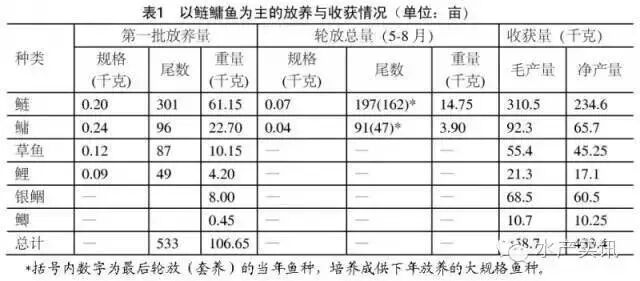 3、以草食性鱼为主的混养模式 本模式通过投喂青饲料主养草鱼和鳊、鲂,以草食性鱼的粪便带动鲢、鳙和鲤、鲫鱼的产量。年初一次放养两种不同规格的鲢、鳙鱼种供轮捕,不再轮放鱼种,仅套养少量夏花,为下一年培养大规格鱼种。鲤、鲫鱼二年养成商品鱼。放养模式见表3。