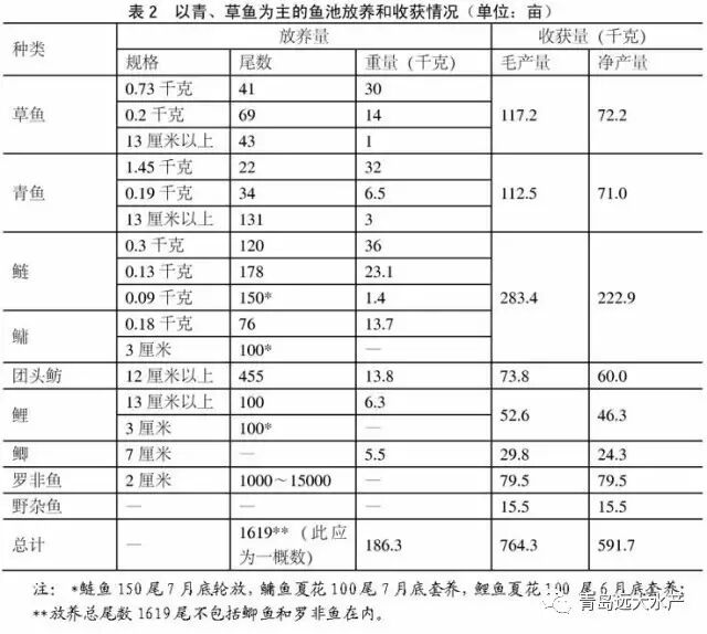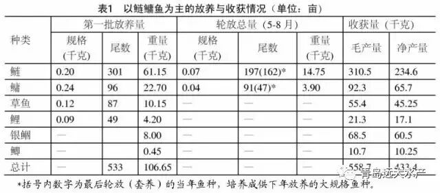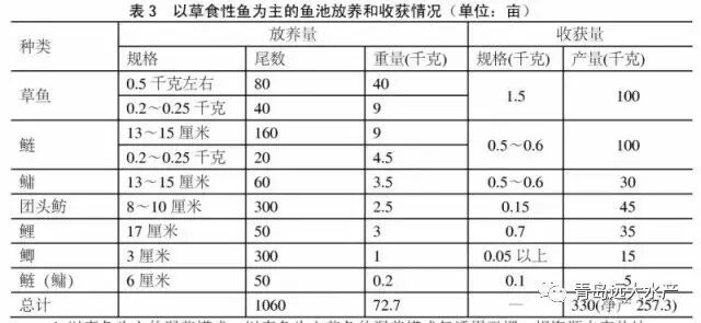 在该模式中,主养鱼青鱼、草鱼的放养量相近,占总放养量的45%,鲢、鳙放养量也较大,占40%。青、草鱼放养1-3龄的鱼种,分别养成食用鱼和大规格鱼种,同时,轮放套养的1龄鲢、鳙、鲤夏花,为下一年成鱼放养提供鱼种(表2)。