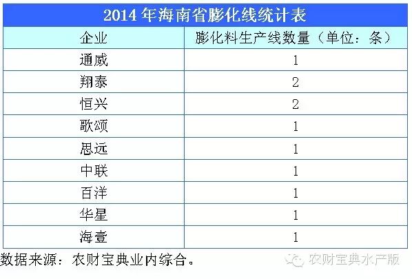 近两年海南罗非鱼料市场占有率第一的翔泰,在原有一条膨化线的基础上,2014年再增加一条时产16吨的膨化线。一直主打沉水料的裕泰,也在这一年开始涉足膨化料,该公司全新膨化线将于2015年5月投产。歌颂是海南本土企业,2012年进入行业,一直主推罗非鱼膨化料,市场表现抢眼,该公司近期也将增加一条膨化线。