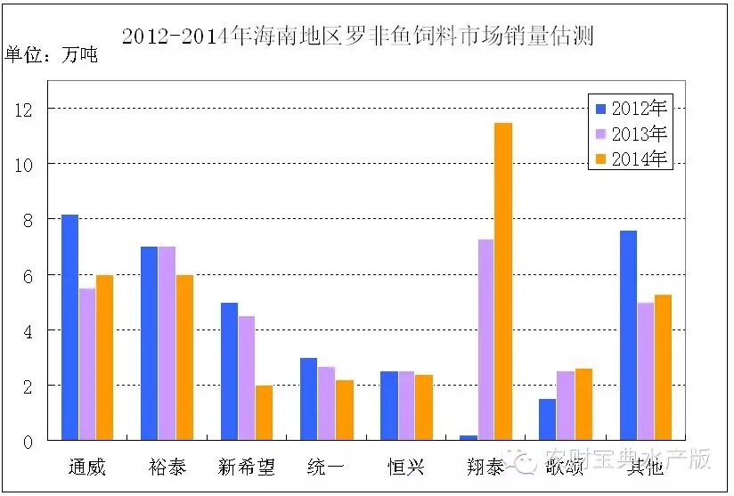 据《农财宝典》估测,2014年海南罗非鱼料(沉水料+膨化料)市场份额是翔泰11.5万吨,翔泰6万吨,通威6万吨,新希望2万吨,统一2.2万吨,恒兴2.5万吨,歌颂2.6万吨,其他企业5.2万吨,合计约38万吨,比2013年约增长1万吨。