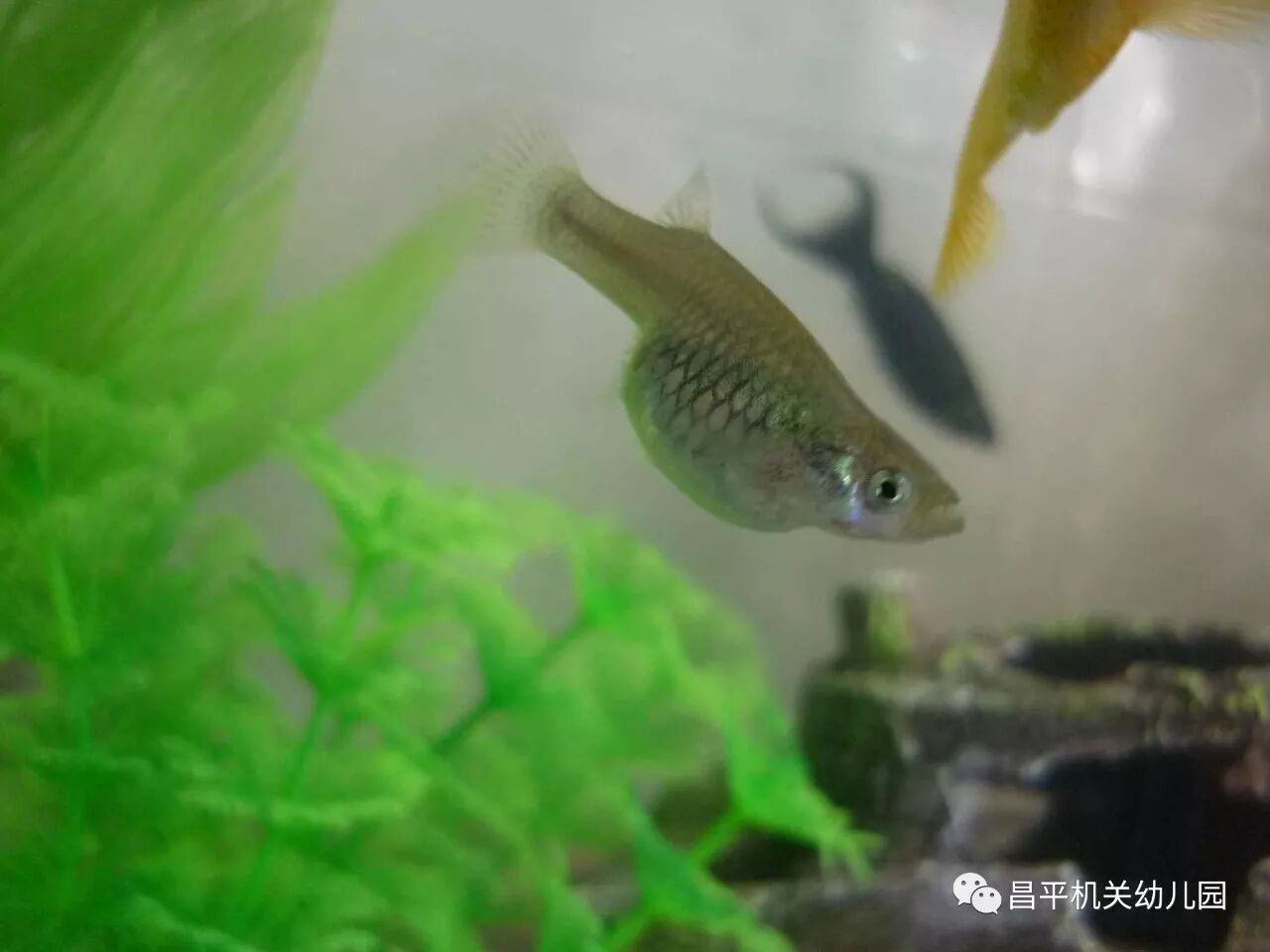 刘佳钰:这条孔雀鱼还在角落里躲着,不出来。