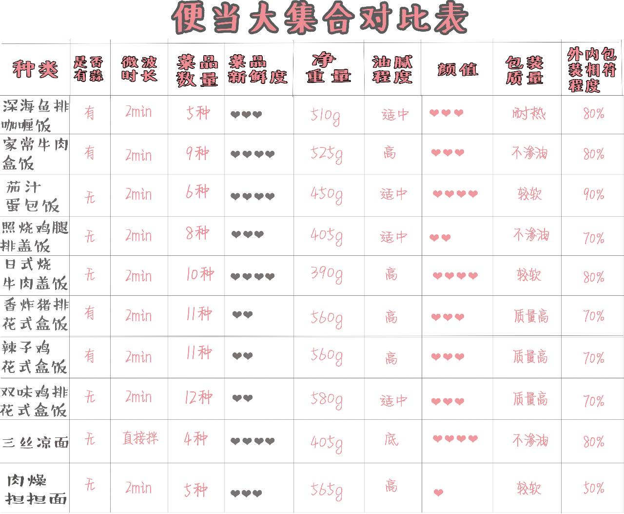 根据阿Y以上精分的分析测评,最后来一个一本正经的测评总结,从大家伙最关心的是否有蒜、速度党们在意的微波时长,还有营养派们的菜品丰富营养度,颜值党们要看脸,一张图直接甩你脸上!最刺激的是献给wuli最酷的健身党们一张便当卡路里表!要看多走心,直接甩图给你们!
