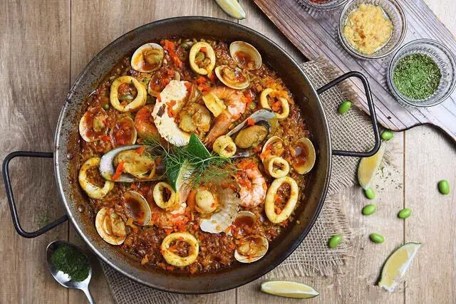 黑漆漆的一盘海鲜饭,上面铺满各式鲜美的海鲜,饭完全吸收海鲜的汁水,鲜咸软糯,颠覆了以往普通的海鲜饭,值得一试!