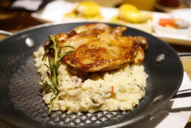 迷迭香烤鸡腿排也是强烈推荐,超大一个鸡腿,外皮酥脆,鸡腿肉鲜嫩多汁,烩饭入口浓浓的奶油香。