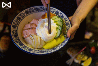 直接在你面前开火!三文鱼和元贝瞬间被秒“热”,香气从碗里跳出来!边上还有满满的螺肉、青瓜、姜片、海带丝和“震腾腾”鸡蛋!简直就是半生熟鸡蛋的典范!