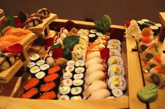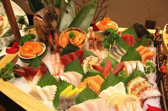 刺身全部新鲜活造,营养丰富!三文鱼、吞拿鱼、油甘鱼、活立鱼、白金枪、白爪鱼、北极贝、甜虾等空运时令海鲜,厚切味美!