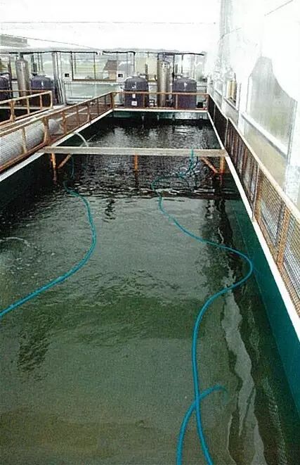 温室饲育房,共10座。一池容纳100吨的水,一共30个池,总水量约达3500吨。
