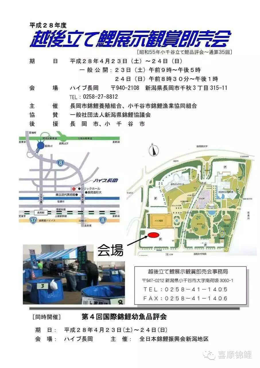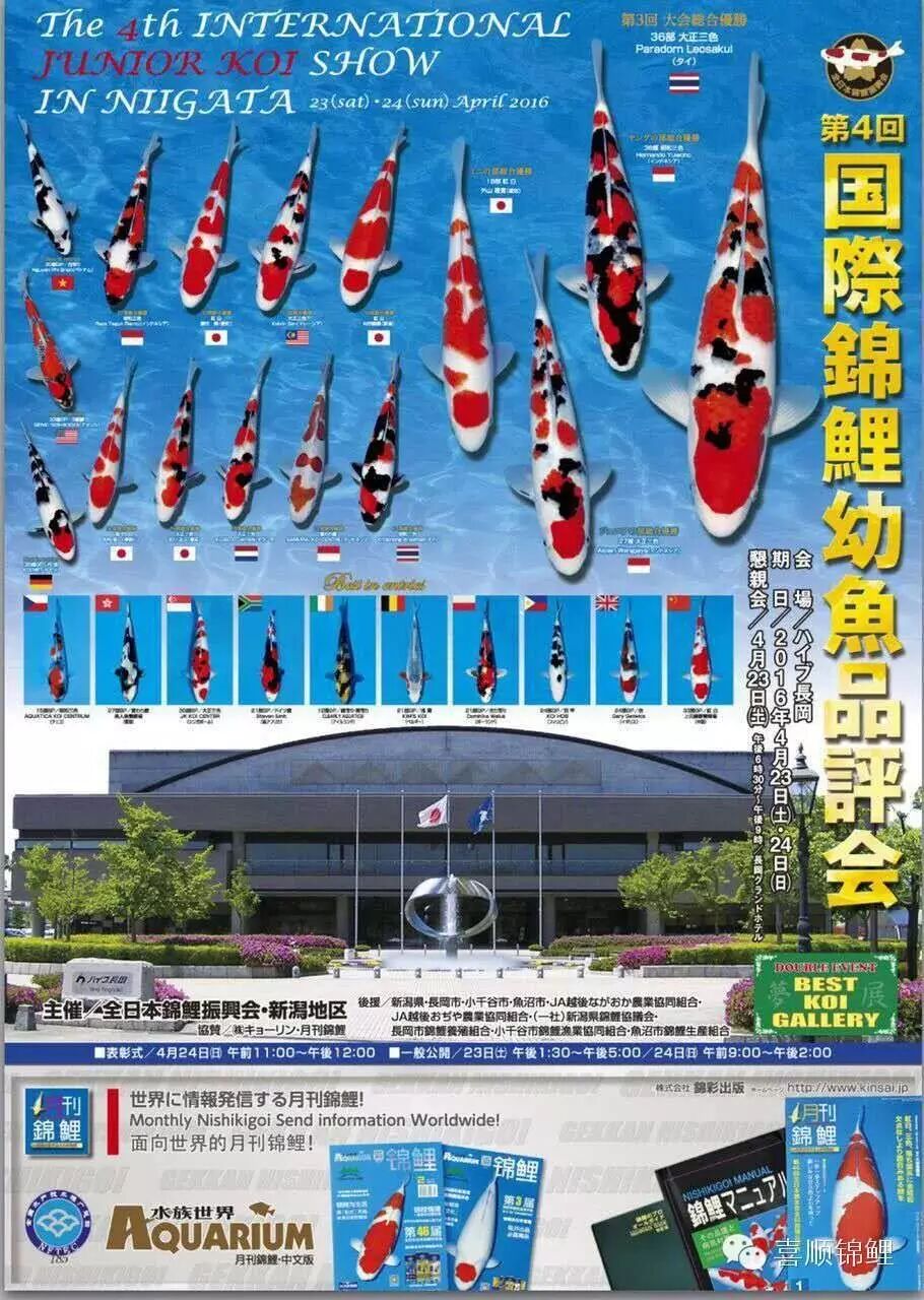 本次在小千谷市举办的第四回国际锦鲤幼鱼品评会(新泻地区)。本届品评会由全日本锦鲤振兴会举办,为期两天。该项锦鲤品评会在全世界锦鲤爱好者中间享有声望,有很多世界各地业者和爱好者的高级锦鲤参加到这项盛会当中。最高峰时,曾有4700条锦鲤参赛。有很多来自全世界的展商参加品评会,锦鲤为大家架起一道沟通的桥梁。尽管日本人和外国人之间有语言障碍,但锦鲤却是一种世界性的语言。在品评会上,锦鲤会按相同的品种和大小归类。评出一条获得全体総合优胜的锦鲤。根据品种给每一部别最佳锦鲤授予奖项。此外,还有为锦鲤发展做出贡献的个人设立的特别奖等。