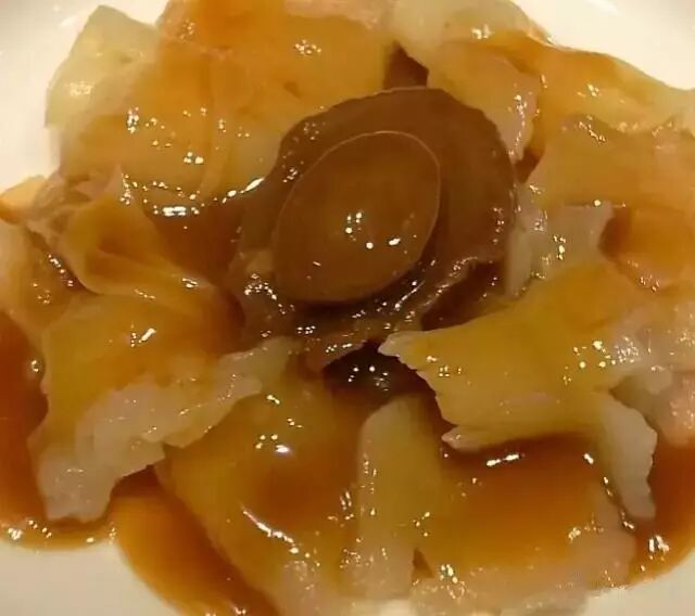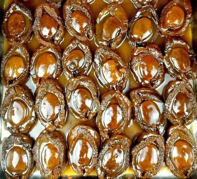 ▼接下来便是我们的主菜了,是称为人间极品的溏心干鲍,制作干鲍是门技术活儿,要经过反复地晒干,长时间泡发,才能有中间不凝结半液体状态的“溏心”。再经过古法煮制,与秘制酱汁的料理,才会有中心部分黏黏软软,入口时质感柔软又有韧度的溏心鲍鱼!