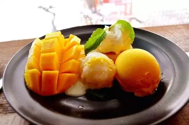 最特色的芒果糯米饭,芒果、糯米、冰淇淋球,淋上椰浆,就这么简单,但就是能好吃到飞起。几乎泰国的每个角落,随便找找就能发现芒果糯米饭,有街边摊版本也有高级餐厅版本,味道自然是谁吃谁知道。