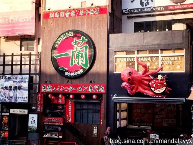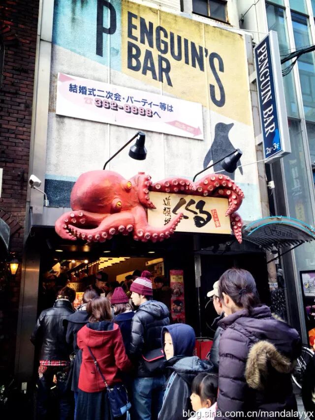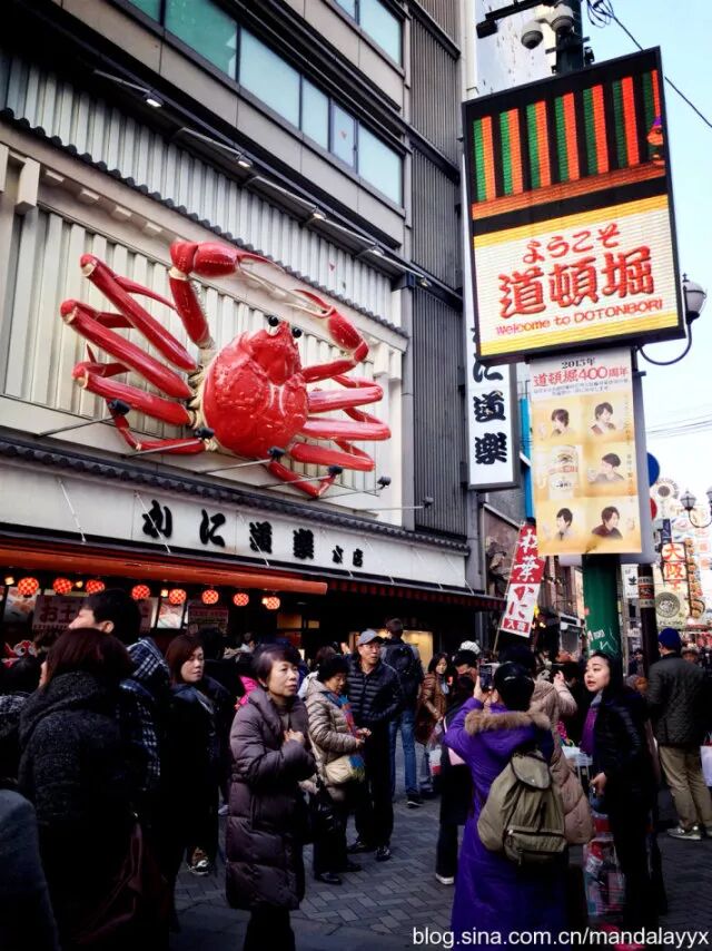 这里要向大家推荐几个大阪的名吃①千房的大阪烧:这里的大阪烧应该是吃过的最美味最实惠的了,可爱的厨师大叔当着你的面烹饪格式的大阪烧,从原料到最后成品,看得清楚吃的明白,每个人面前还有一个铁板,喜欢吃什么样的火候完全自助。②甲賀流的章鱼小丸子:章鱼小丸子这个国内超有名的小吃就起源于大阪,和国内的基本全是大面来说,这里真的是可以吃到大颗章鱼和蔬菜的大丸子,道顿崛贩卖小丸子的店面很多,其实每家都差不了多少,甲賀流因为成立时间久,经常会推出一些创新的口味而著名,小小的店面门前每天都是人山人海,可见有多么受欢迎。再推荐几个微博上比较火爆的店面:③炸串猪排--串カツ屋台ふくろう④乌冬面--道頓堀今井⑤日式火锅--治兵衛!最后一定要隆重推出蟹道乐的螃蟹宴(http://douraku.co.jp.c.at.hp.transer.com)他们家的招牌十分的容易辨认,大大的螃蟹悬挂在本店外面,因为时间关系没能预定上螃蟹宴,光从他家分店遍地的情况下就可以判断有多好吃,吃货们,来大阪一定不会失望的!