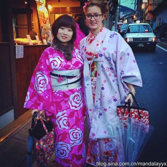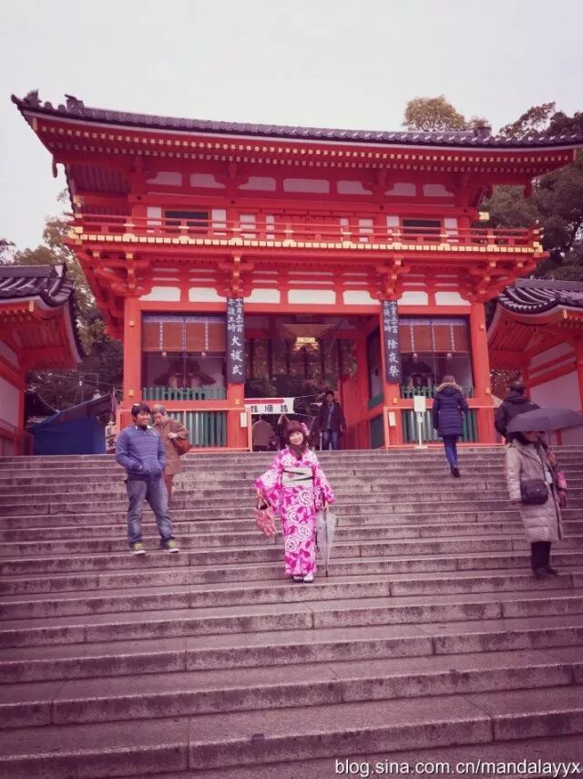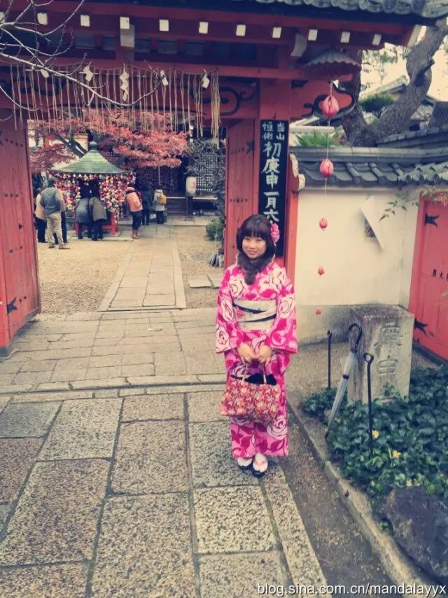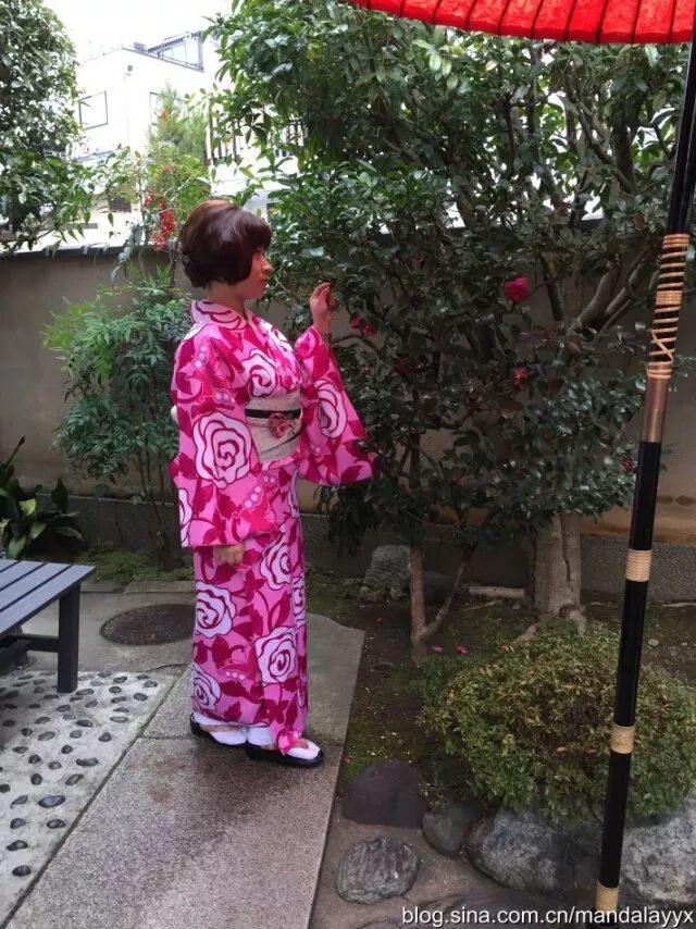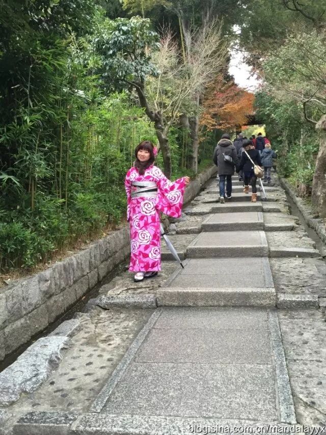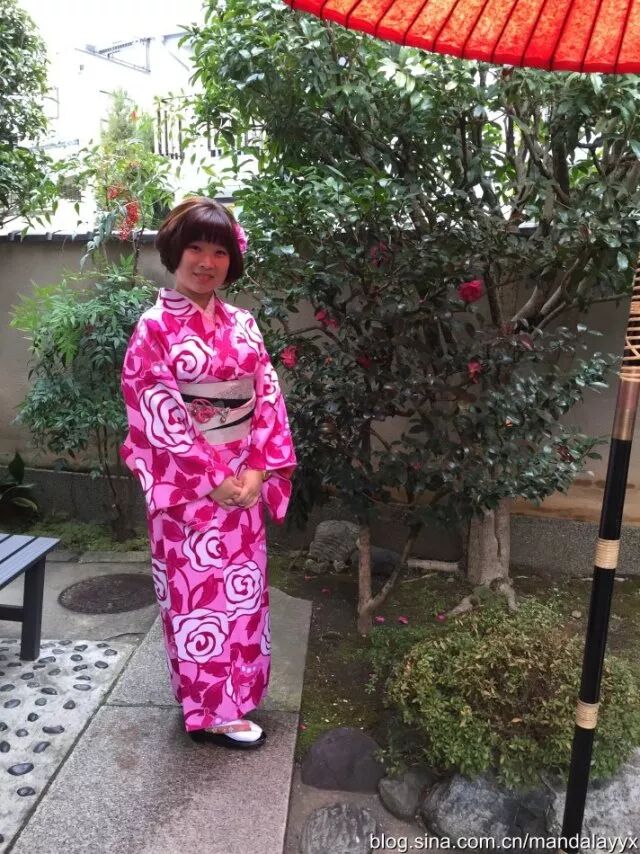 京都最令我兴奋地部分就是感受当地的和服文化。前往网络上很红火的「冈本」(中文官网:http://www.okamoto-kimono.com/tw/)租一套和服(可以租借一天),像当地人一样穿梭在京都的石板小路,穿越的感觉想想都觉得美妙。冈本提供600多套和服,5000日元可以选择正装套餐,4种和服必备的配件自我搭配。因为最近爱上了玫红色,特别选择花枝招展的玫红出镜,再配上发型设计师做的日本卷翘发型,朋友说特别有日本娃娃的感觉。和服看着美丽,穿起来可是十分费劲儿,耗时1个小时才从头到脚装备完毕,好在有不同的层次,大冬天单穿和服在外行走也不觉得冷。作为女汉子穿和服也真是醉了,因为下身裙摆狭窄,木屐穿着又不方便大步行走,装备完毕后真的连走路都太像日本女人,小碎步吧唧吧唧,连带着整个人都温柔起来。