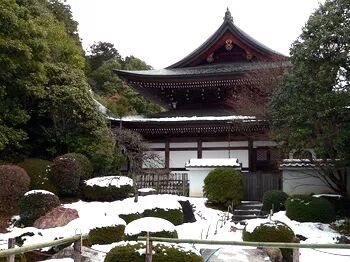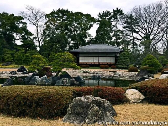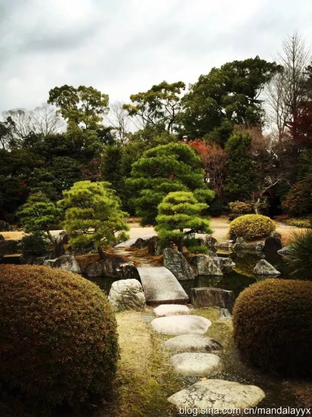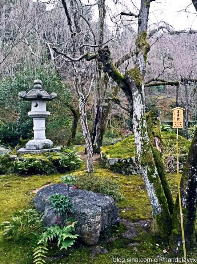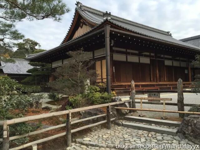 距离金阁寺不远的龙安寺是日本庭院的代表寺庙,又是一座世界文化遗产寺庙,亭台楼阁花园木雕,石头的「硬」配合植物的「软」,自然的一切在这里融合的是那么美妙,漫步于日本庭院间,伸手抚摸走过历史风风雨雨的木质建筑,顿时有一种恍然间穿越回过去的感觉,虽然冬日时节庭院不比春日绚丽灿烂,但龙安寺却是最适合冬天观赏的庭院,因为这里是日本「枯山水」园林的代表。枯山水一般是指由细沙碎石铺地,再加上一些叠放有致的石组所构成的缩微式园林景观,因为没有水景被称为「枯」山水。其中的「水」通常由砂石表現,而「山」通常用石块表現。枯山水常被认为是日本僧侣用于冥想的辅助工具,观看着这些静止不变的元素,连自己的内心也平和安详。