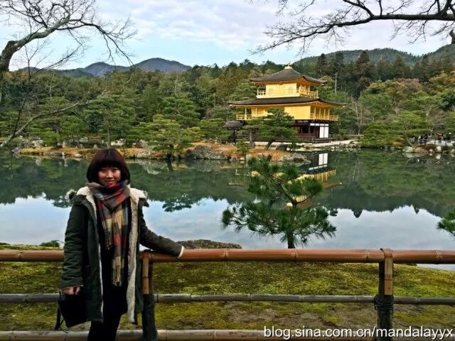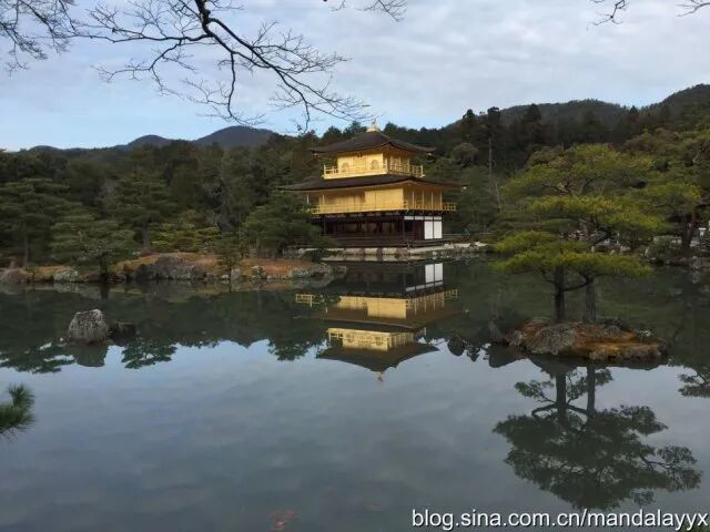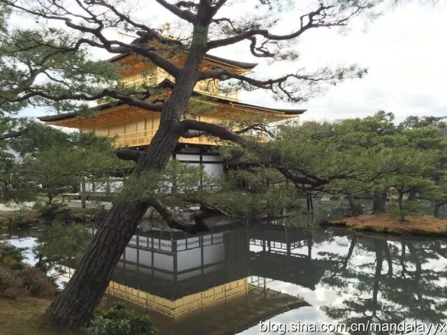 如果一定要在京都选一座寺庙参观,那金阁寺(原名鹿苑寺,因为外镀金箔所以以金阁寺闻名)一定是最不可以错过的景点。这天天空灰蒙蒙的,当我抵达金阁寺时正赶上太阳初露光辉,一缕阳光洒射在金箔镀金的金阁寺上,顿时光辉万丈,尤为惊人。金阁寺最早完成于1397年,被日本政府列为「国宝级」建筑,同时也是世界文化遗产,金阁寺的门票(400日元)也颇为特殊,是一张写满祝福的话语和福符,十分具有收藏价值。