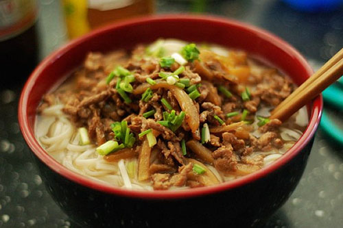 4、将调味料放面碗内,盛入面条,铺少许炒好的榨菜肉丝并撒葱花少许即成。