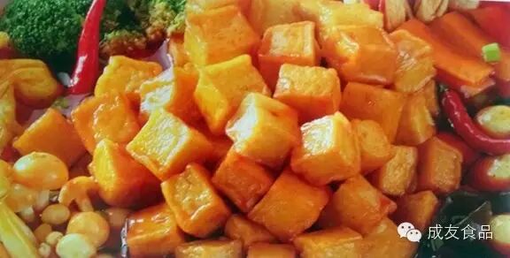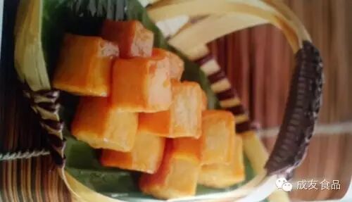 制作方法:1.原料选择:由于鱼豆腐对弹性及色泽的要求较高,所以要选择原料新鲜,含脂肪较少,肉质鲜美,弹性强的白色鱼肉。一般多用冷冻生鱼糜或冻鱼。 2.擂溃:鱼豆腐的加工过程在擂溃之前与鱼糜制品的一般制造工艺基本相同,只是漂洗的工艺更为重要(对于弹性强、色泽白、呈味好的鱼种也可不漂洗)。擂溃的方法:分为空磨、盐磨和本磨(搅磨)。空磨,起到破坏鱼肉细胞纤维的作用,然后加盐,促使盐溶性蛋白质溶出,形成一定粘性,再加其它辅料进行搅磨约20~30分钟即可。 3.铺板成型:鱼豆腐的成型,小规模生产时往往以手工成型,但这需要相当熟练的技术。现在逐渐采用机械化成型,其原理是由送肉螺旋把鱼糜按鱼豆腐形状挤出,连续地铺在板上,再等距切断而成。如制三色鱼糕,则将上述配料鱼糜分成三份。一份加鸡蛋清(6%)、红米粉(2.2%)、胡椒粉(适量),制成红色并具辣味(也可不要辣味);一份加鸡蛋黄(8%)配成黄色;一份为原有的本色(白色)。将上述红、黄、白3种不同颜色的鱼糜分别置于三色鱼豆腐机中3个不同的料斗中(其中本色鱼糜放入大斗中),铺板成型的鱼豆腐即为三色鱼豆腐。 4.加热:鱼豆腐的加热有焙烤和蒸煮两种。焙烤是将鱼豆腐放在传送带上,以20~30秒的时间通过隧道式红外线焙烤机,使表面着色有光泽,然后再烘烤熟制。一般以蒸煮较为普遍,目前已普遍采用机械化蒸煮。 5.冷却:鱼豆腐蒸煮后须立即在冷水(10~15℃)中急速冷和,使鱼豆腐吸收加热时失去的水分,防止干燥而发生皱皮和褐变等。并能使鱼豆腐表面柔软和光滑。急速冷却后鱼豆腐的中心温度仍然较高。通常还要放在凉架上自然冷却。冷却室的空气要进行净化处理并控制适当的温度,最后用紫外线杀菌灯进行鱼豆腐表面的杀菌。 6.包装与贮藏:完全冷却后的鱼豆腐,可用自动包装机包装。包装好的鱼豆腐装入木箱,放在冷库(0℃±1℃)中贮藏待运。一般制造好的鱼豆腐在常温下(15~20℃)可放3~5日,在冷库中可放20~30天左右。国内还很少采用鱼豆腐包装机,大都是生产后及时销售;有时加工后用油纸或塑料袋包装后放冷库贮存,以待装运销售。 质量标准:鱼豆腐成品要求外形整齐美观,肉质细嫩,富有弹性,并具有鱼豆腐制品的特有风味,咸淡适中。