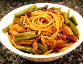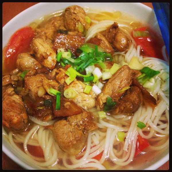 材料: 白斩鸡数块、面条、黄瓜、芝麻酱、麻油、糖各1大匙、酱油2大匙、辣椒粉适量