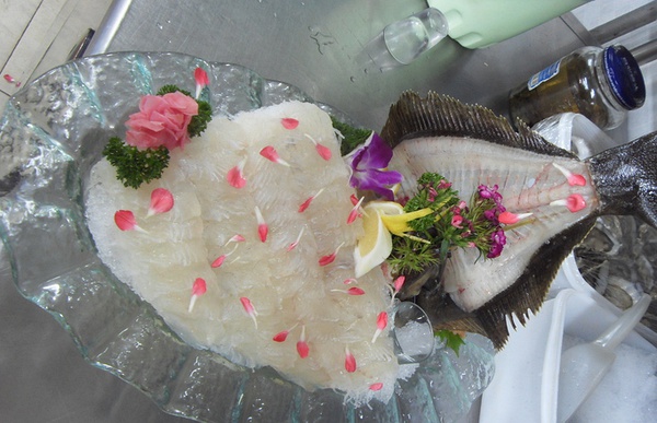 正确的吃法:近海活鱼刺身一定要吃新鲜的!鱼皮会影响口感,去皮后的鱼肉较薄,切成大片状较适宜,生吃蘸芥末。