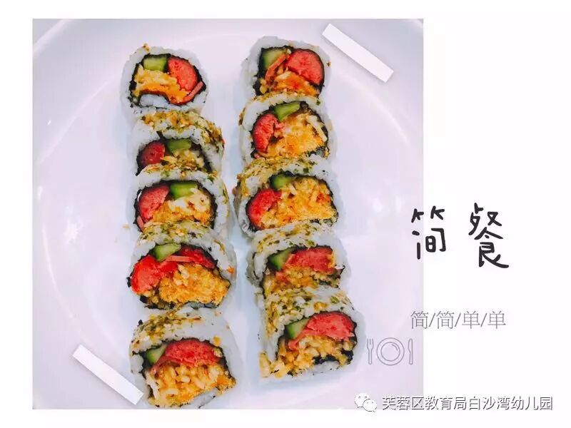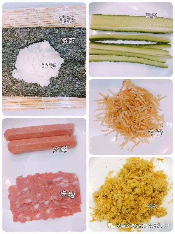 一:竹帘1张,海苔6片,火腿少许,牛蒡一小蝶,肉松 少许,黄瓜条少许,培根一小蝶
