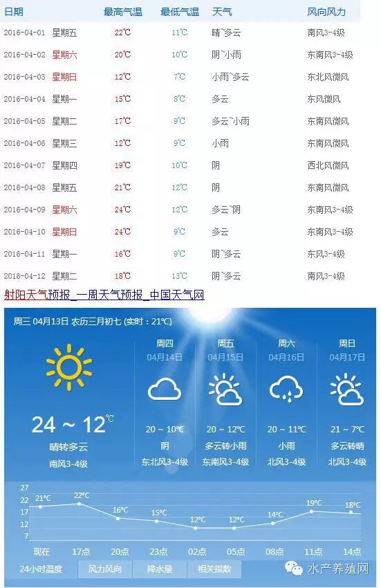 四月份以后,江苏盐城射阳地区天气情况总体不太好,连续的阴雨多云天气,直到今天才是晴转多云,接下来三天又开始了阴雨天气,周日多云转晴。这种晴天很少的情况不单单在射阳一个地方出现,今年全国不少地方都有这个情况,气象专家预测今年春天的降水量比去年要高,其中很大一部分是受厄尔尼诺影响,虽然近期厄尔尼诺有逐渐减弱的趋势,不过很快梅雨天气又会到了,可以说今年无论是哪个水产养殖品种,受到天气的影响会更加明显,养殖户一定要提前做好防范措施。