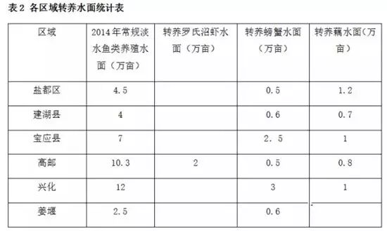 从表2可以清晰看出,鱼塘转蟹的面积最大,近8万亩,其次是转养藕,面积约5万亩,而罗氏沼虾转养主要集中于高邮区域,转养面积约2万亩。盐都、建湖、宝应以大水面为主,转养蟹和莲藕的水面较多;姜堰区域因为存塘鱼未卖,因此难以转养。