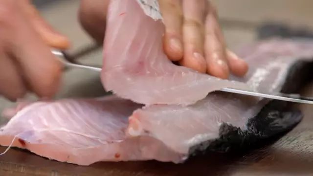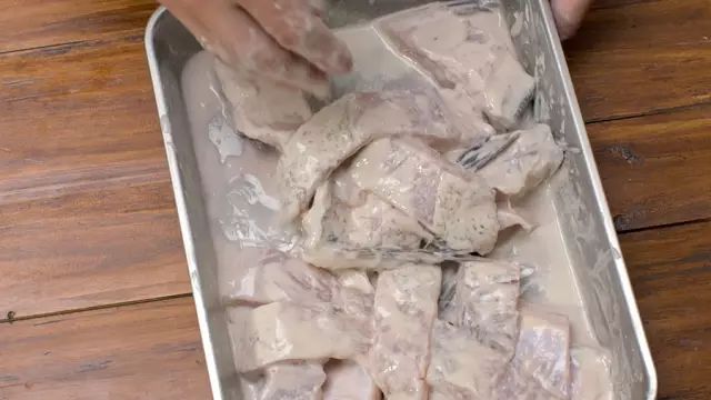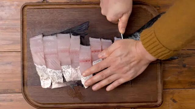 2、从鱼腩上剔下鱼排的时候,可以留少许一层鱼肉,炸出来口感会更好;
