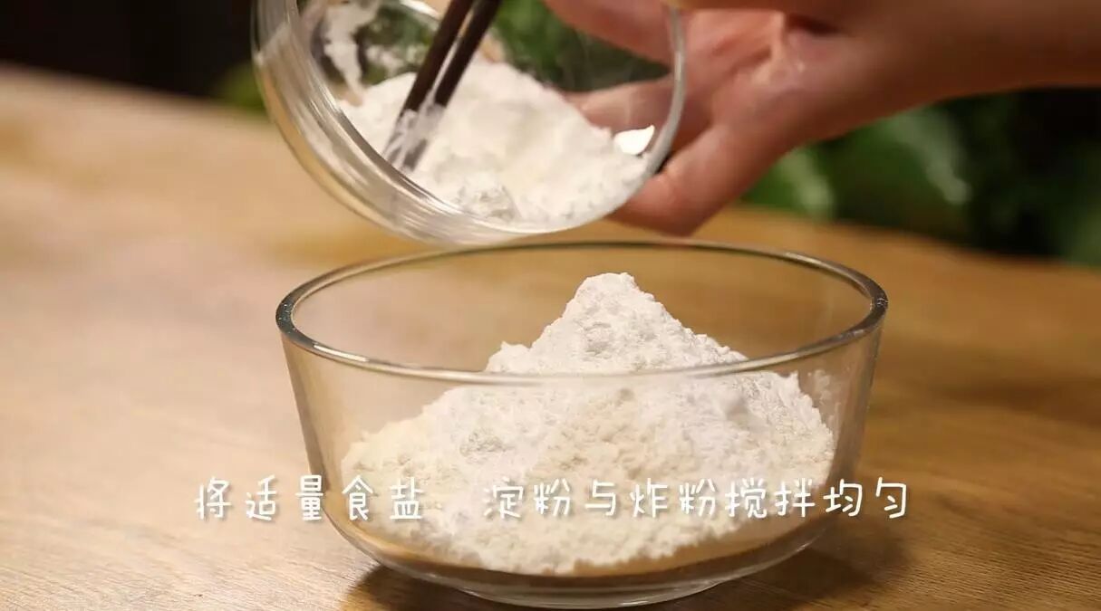3、将适量的食盐、淀粉与炸粉搅拌均匀