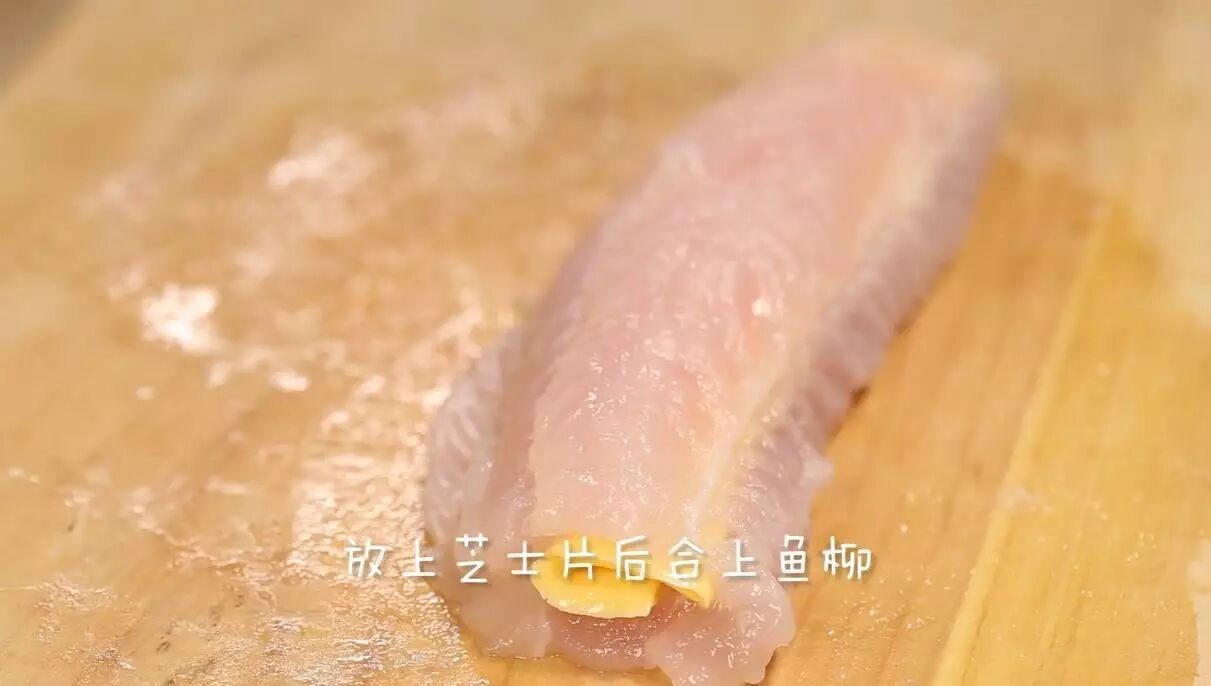 2、将鱼柳从中间切两半,不要切断,中间夹上芝士片