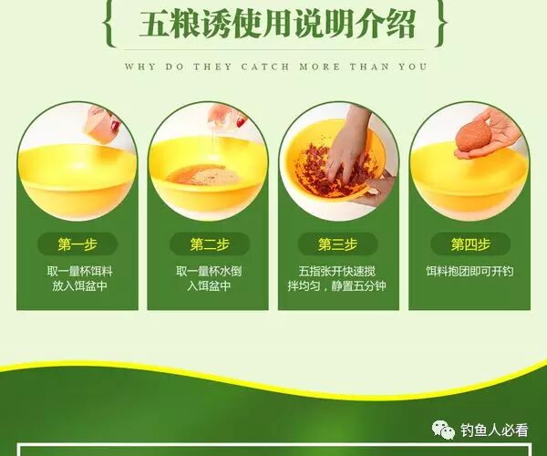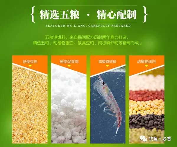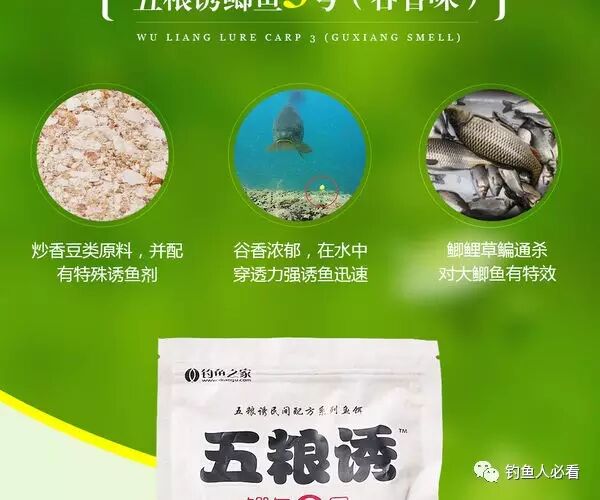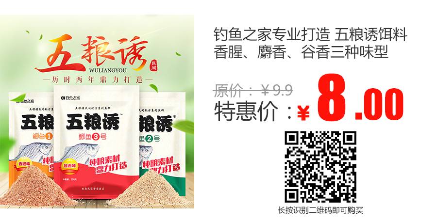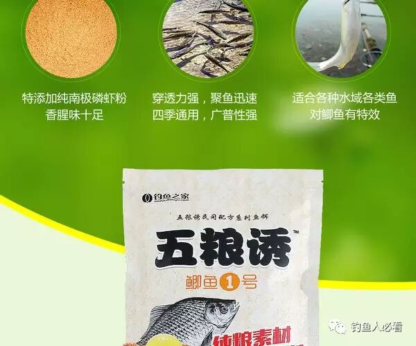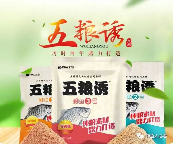 关于饵料配方,五粮诱饵料可1:0.9单开,也可以作为辅助饵搭配对象鱼饵料,比如草鱼的话:五粮诱+超诱+钓鱼之家草诱;通杀版:五粮诱+野战蓝鲫或野战蓝鲫+速攻(经典搭配)。以上商品商城均有售!