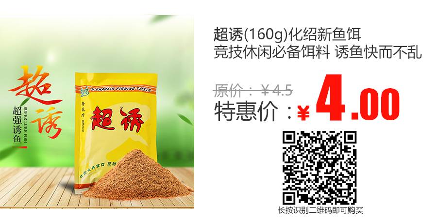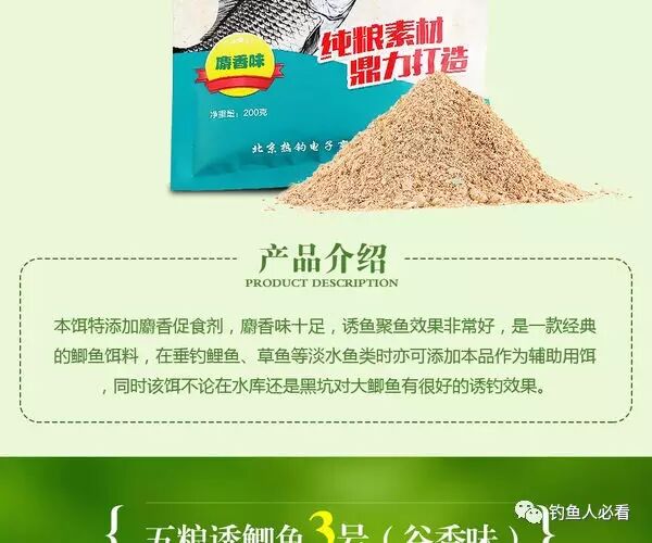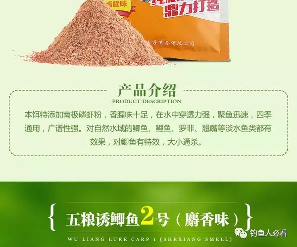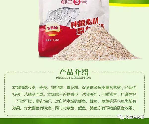 历时两年,鼎力打造,五粮诱鲫鱼饵分香腥、麝香、谷香三种味型,特添加多种动植物蛋白和诱食剂,湖库、野塘、黑坑皆可使用,本饵可搓可拉使用方便。外出垂钓带上两包,保证您有意想不到的收获。购买(套装)可获赠随机一袋饵料(套装共4袋)。