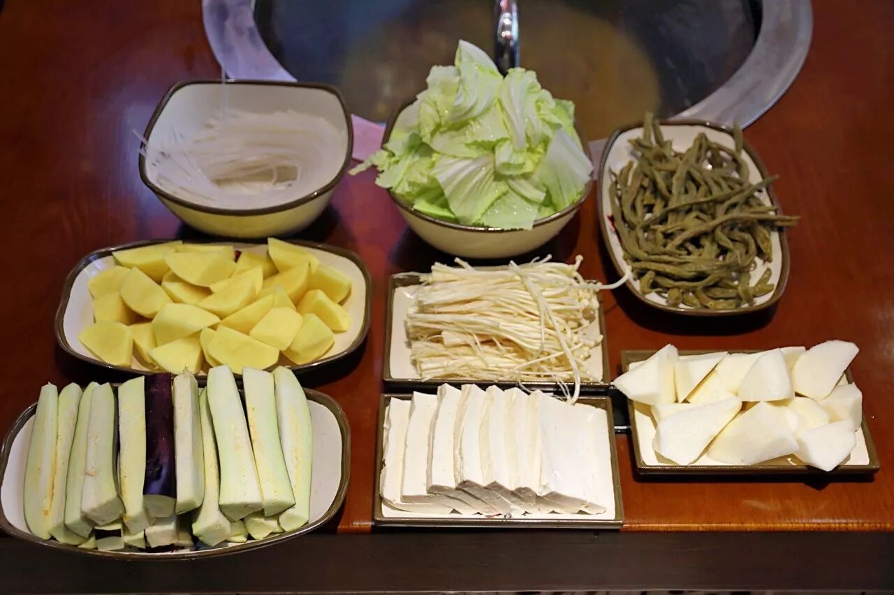 如果你偏爱肉的话那么可以点酱香骨头锅、农家纯小笨鸡锅、排骨鸡手锅、猪脚翅中锅,除此之外可以单点粉条、豆腐、白菜、土豆、茄子等配菜,荤素搭配。
