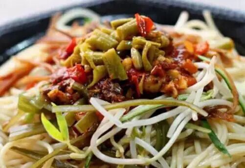 碱水面一袋、海带、黄瓜、大头咸菜、绿豆芽、酸豆角、蒜末、盐、鸡精、胡椒粉、生抽、香醋、油泼辣子、陴县豆瓣、剁椒酱、芝麻酱、花椒水