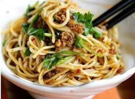 鲜面条半斤、芽菜、花生仁、香葱、酱油、香油、醋、白糖、辣椒油
