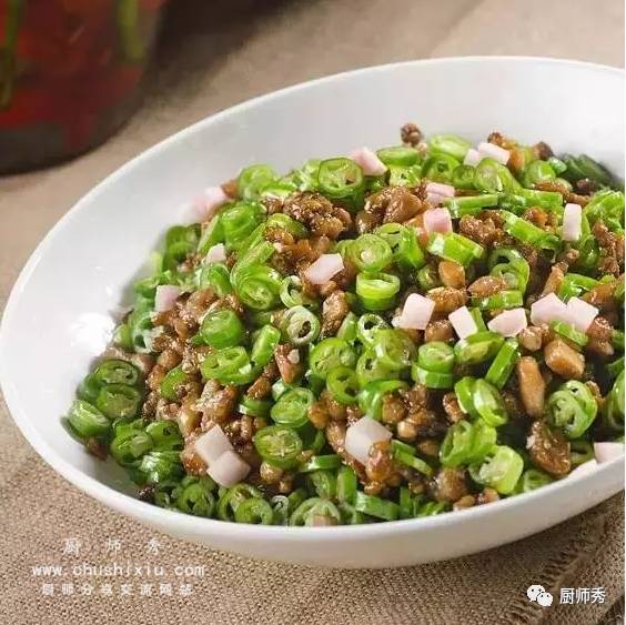 3、锅里留少许底油,投入姜末、蒜末和芽菜末炒香后,倒入鸡米、青椒圈和泡菜粒炒匀,撒入葱花稍炒便好。