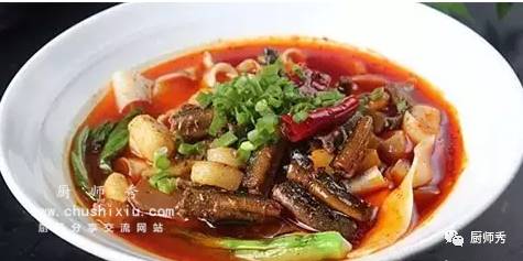 4、把手扯面条下沸水锅里煮熟,捞出来放入用红油、盐、花椒粉、味精和鲜汤调制的底汤碗里,摆上汆熟的菜心并舀入制好的鳝鱼臊子,最后撒些葱花便可上桌。