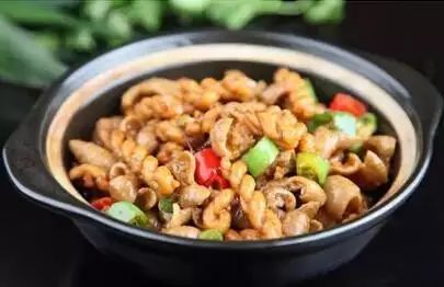 4、油烧热加入豆瓣酱,放入煸干的大肠、青红椒、盐巴、酱油、料酒,炒熟就可以了。