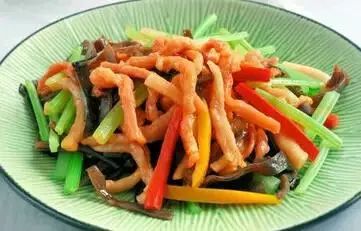 1、芹菜、胡萝卜、青红椒各切成丝,木耳水泡后撕小块备用。
