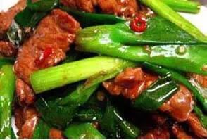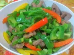 3、热油1大匙,将调料(2)拌炒后,加入牛肉、青椒及调料(3),大火迅速炒拌均匀即可盛盘。
