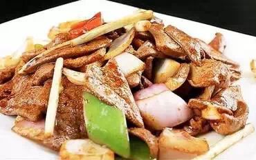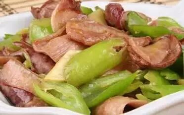 3、炒锅加油烧热加蒜姜炒香放肚片煸炒,加青椒、生抽继续炒入味即可关火