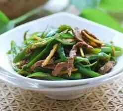2、热油1大匙,加入牛肉丝,翻炒至牛肉九分熟即捞起。青椒丝入滚水约1分钟捞起。