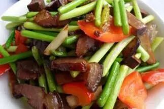 2、锅中烧热1大匙油,放入腊肉爆炒至呈现透明后,再放入蒜苔和红辣椒,加入少许水、酒、胡椒粉、盐和糖调味翻炒均匀就完成蒜苔炒腊肉了